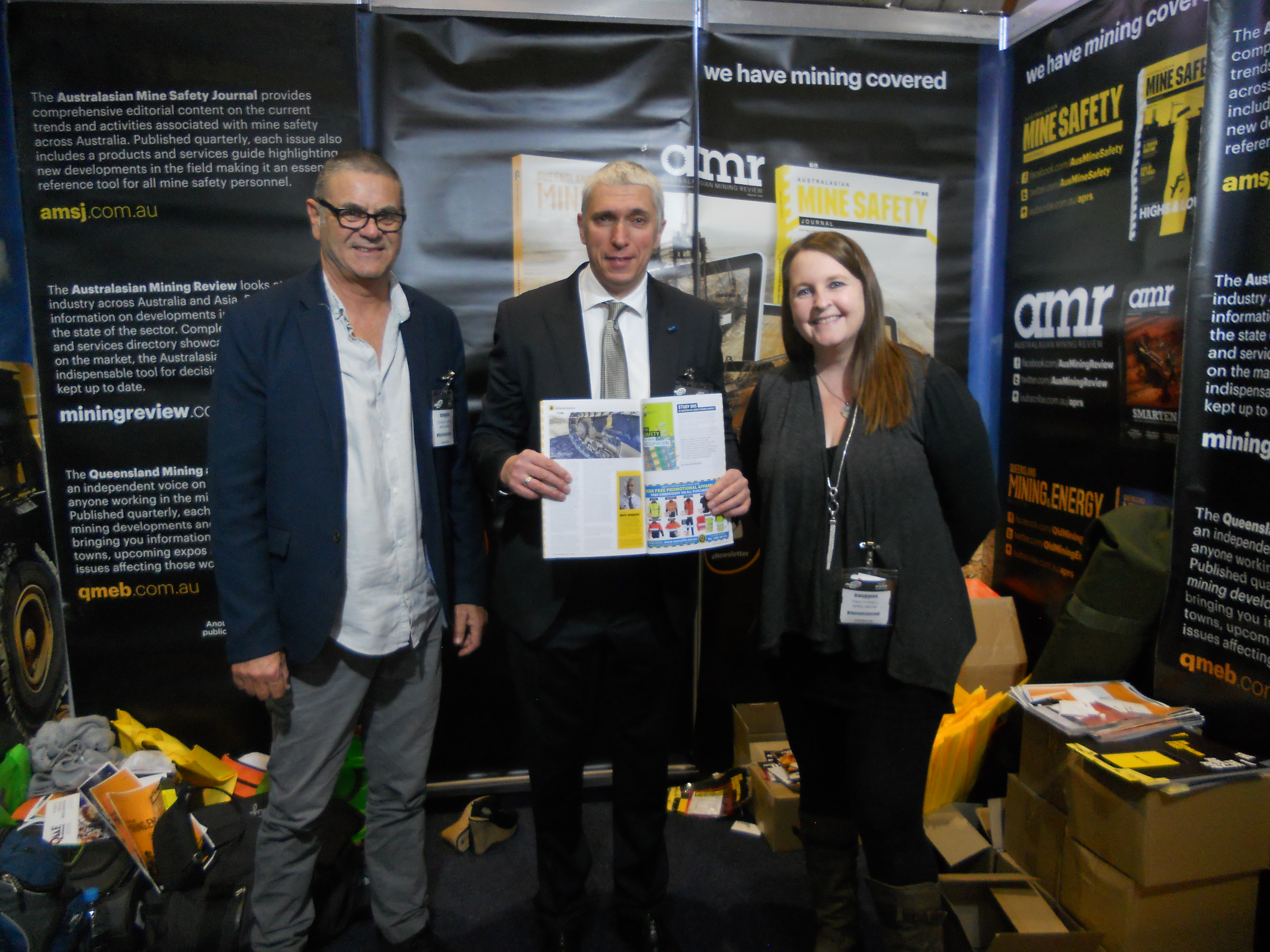 DMITRY PRZHEDETSKY visits AIMEX 2017 and meets with APRS Editor in Chief Tara Tyrell & Director of Sales Charles Werb where he is presented with the latest copy of the Australasian Mine Safety Journal with his article on NOISE MITIGATION (on mobile mining equipment) . It is available for free download here: